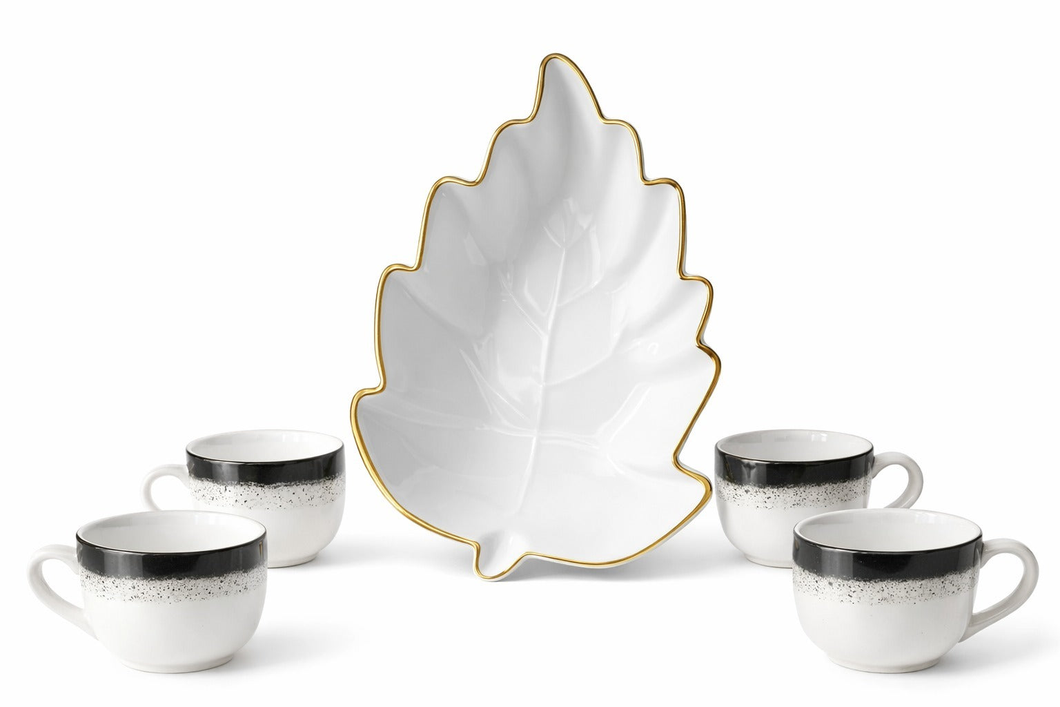 The highlight of this set is the unique leaf-shaped serving plate with a beautiful gold edge, which instantly makes your table look elegant and expensive.